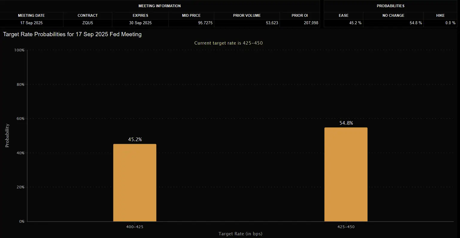 - عقود CME الآجلة: انخفض احتمال خفض سعر الفائدة من قِبَل الاحتياطي الفيدرالي في سبتمبر إلى 45.7%، من 63.4% قبل اجتماع اللجنة الفيدراليّة للسوق المفتوحة.
