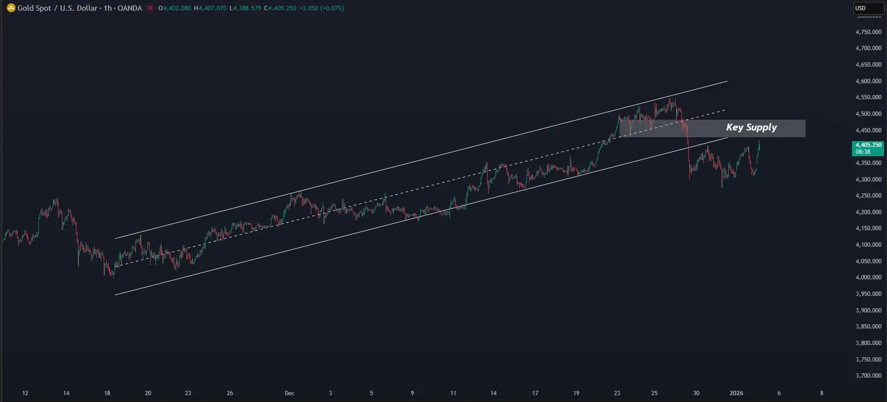 - Gold trades near $4,400/oz, after one of its strongest years in decades.