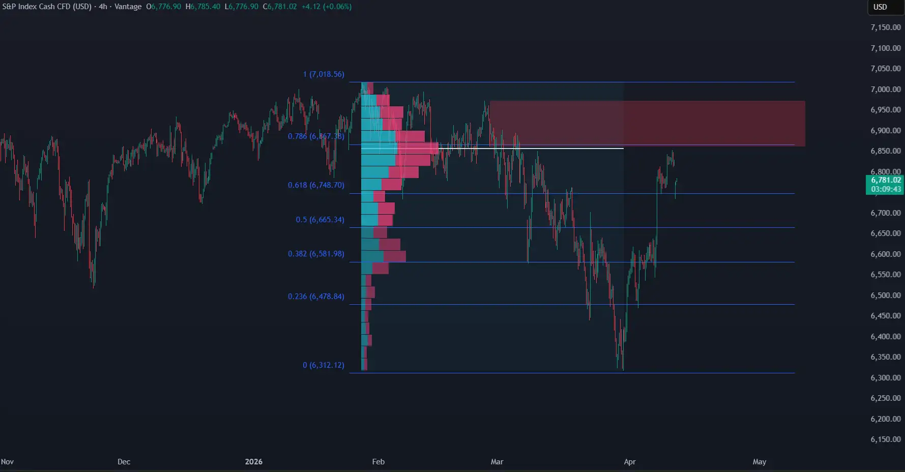 The S&P 500 is currently pushing into a major supply zone around 6,850–6,950, a level that previously acted as strong resistance and aligns with high-volume distribution and the 0.786 retracement. Price is approaching this area after a sharp rebound, which increases the probability of seller re engagement rather than continuation. The structure still reflects lower highs, and this zone represents a prime area for distribution.