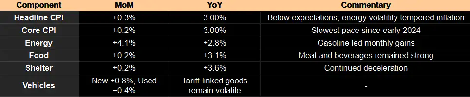 - Core CPI advanced 0.2% m/m and 3.0% y/y, marking the softest pace since early 2024.